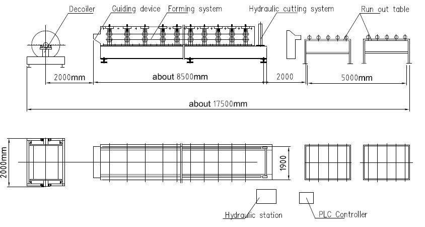 Desenho de layout da máquina formadora de rolos para telhado de metal