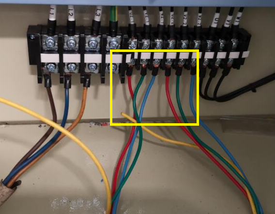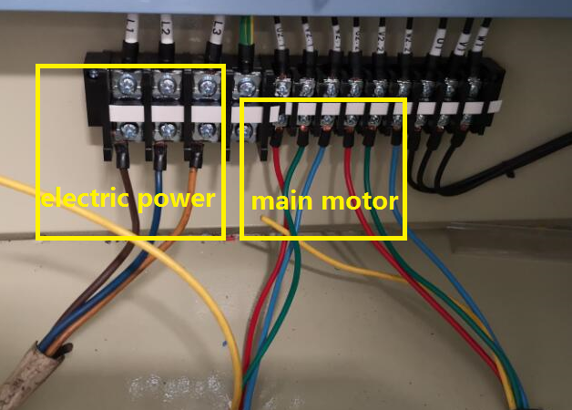 PASSO 7. Abra a porta traseira do controlador. Em primeiro lugar, encontre os fios do motor principal na máquina. Em segundo lugar, conecte o fio do motor principal em U2.1 V2.1 W2.1 e U2.2 V2.2 W2.2. Normalmente, o fio azul se conecta com U2, o fio vermelho se conecta com V2, o fio verde se conecta com W2. Em terceiro lugar, conecte a energia elétrica local com L1, L2, L3 como abaixo: